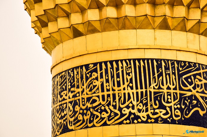 Characterized by majestic domes, minarets, and intricately carved calligraphy adorning its walls, the domes are covered in shimmering gold, while the minarets, with their elegant and slender profiles, serve as beacons, guiding pilgrims to this sacred place.