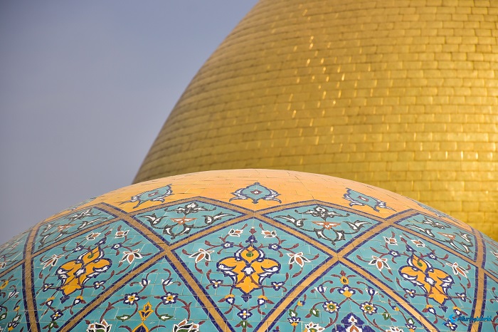 The shrine’s structure embodies a harmonious blend of intricate Islamic and Persian architectural styles, showcasing a rich tapestry of design elements where the exterior itself is a sight to behold, featuring a grand and imposing façade.