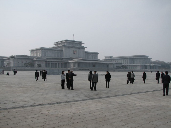 With photo of the great leader Kim Il-sung which is put at the front part of the palace, there is a large 500 meters (1,600 feet) long square on which there are gathering organized from time to time in order to pay respect to the both eternal leaders.